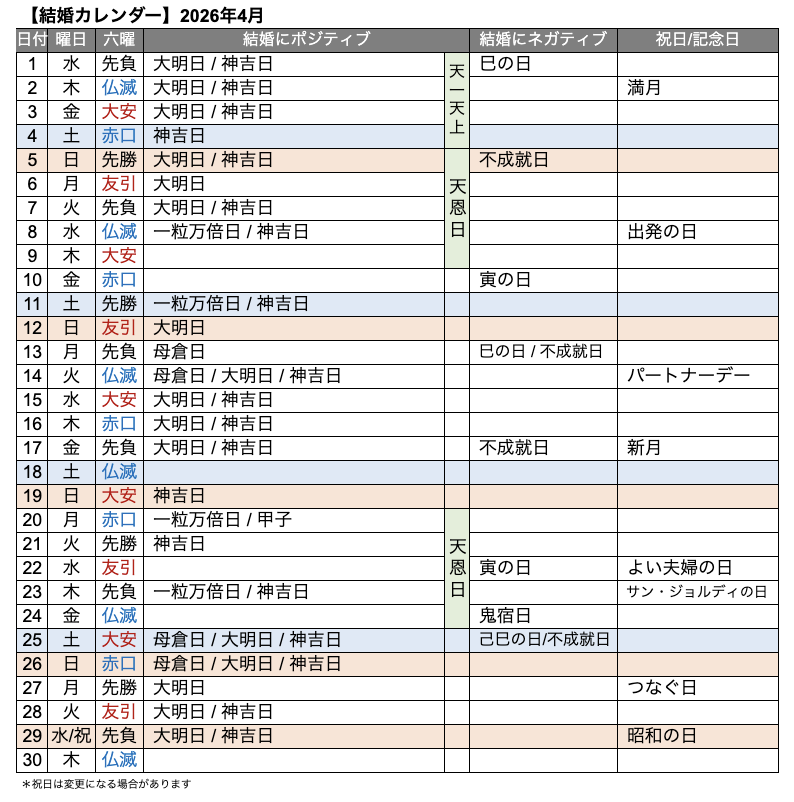 2026年4月は土日祝日に開運日が多く、結婚式や顔合わせに活用できる日がたくさん!ぜひ検討してみてくださいね。