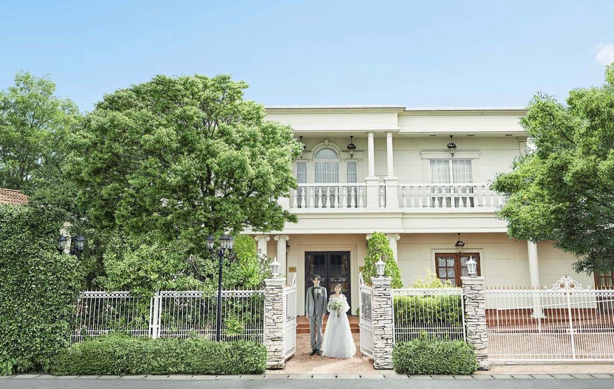 エヴァウイン小山プレミアムスィーツは、木々の緑と青い空のコントラストが美しい白亜の邸宅。