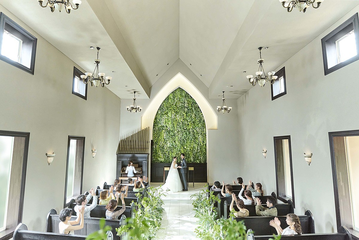 中でも花嫁が心奪われるのがバージンロードの先にある、あふれんばかりの緑の祭壇です。