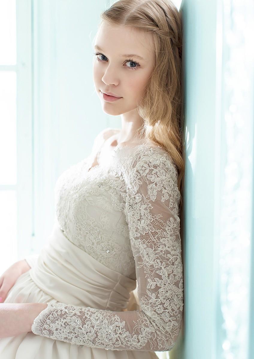 レースのロングスリーブをプラスすることで、クラシカルで気高い印象に仕上がります。