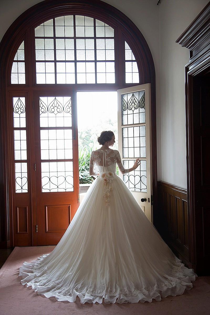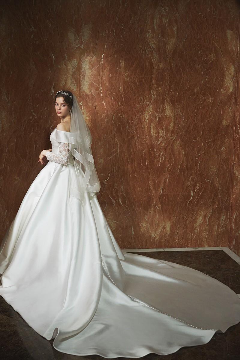 長く伸びるロングトレーンにはくるみボタンを配し、クラシカルなムードに歩くたびに凛とした品格を漂わせます。