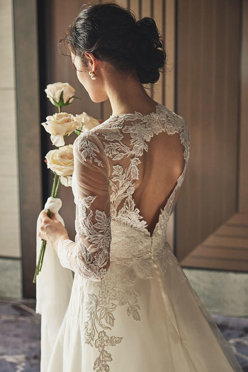 ユミラインの完璧なまでのシルエットと透け感のあるロングスリーブが、エレガントで大人の花嫁を演出します。