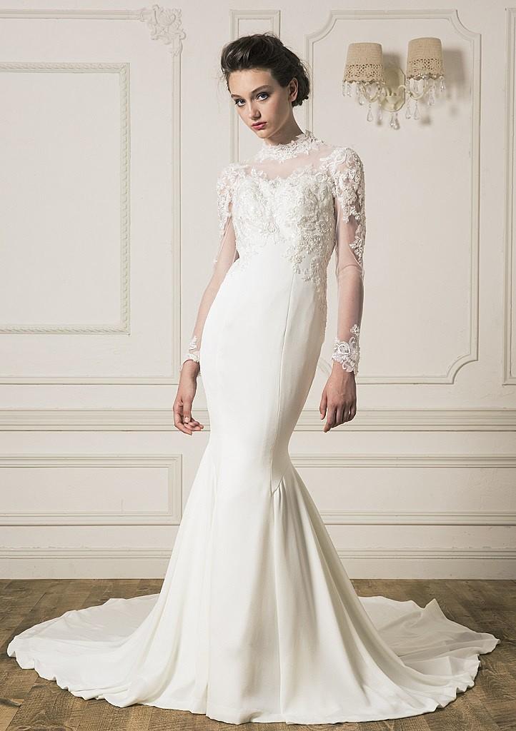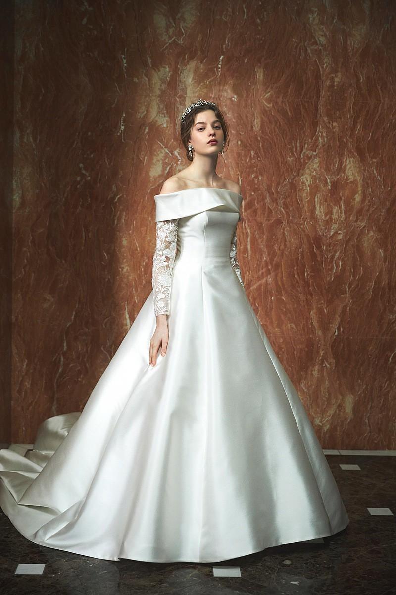 ミカドサテンのロールカラーにレースのロングスリーブを組み合わせたドレスは、ありそうでなかった1着。