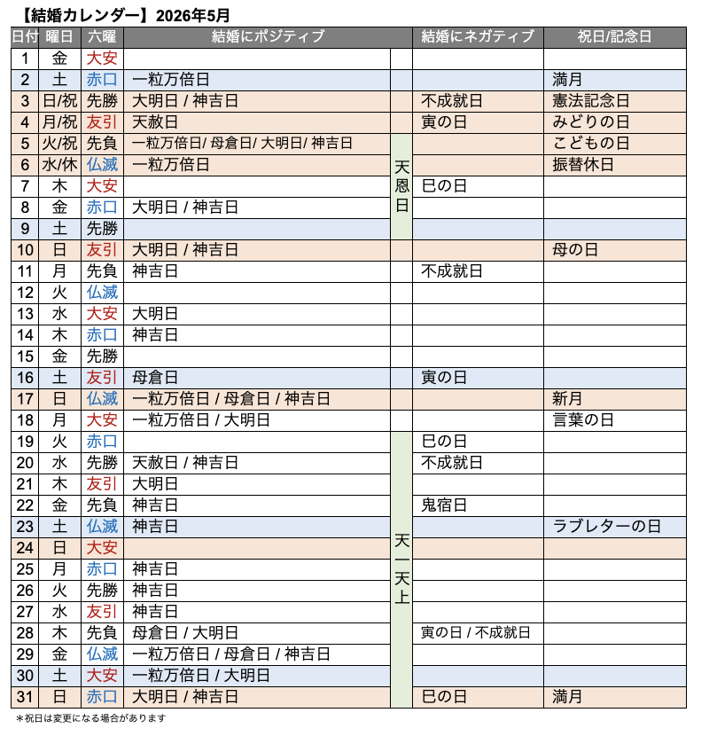 そこで今回は2026年5月の「結婚全般に縁起のいい日」と「内容によって縁起のいい日」、「要注意日」について解説。結婚イベントの日取りに役立ててくださいね。