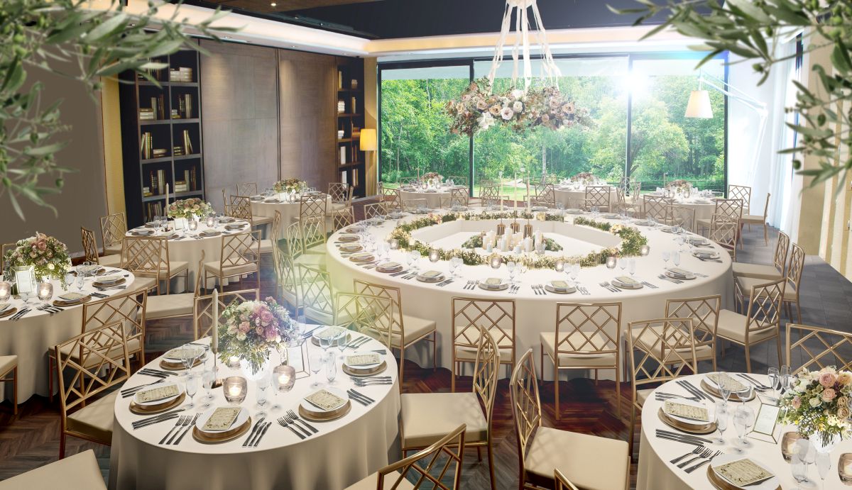 パーティー会場もまたシンプル&スタイリッシュで、ガーデンからの陽光が優しく降り注ぐ空間。