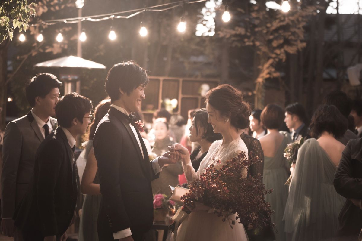 昼は陽光と緑が爽やかなパーティー、夜は無数のキャンドルがきらめく大人のパーティー…と、昼夜で雰囲気が変わるのも魅力的。