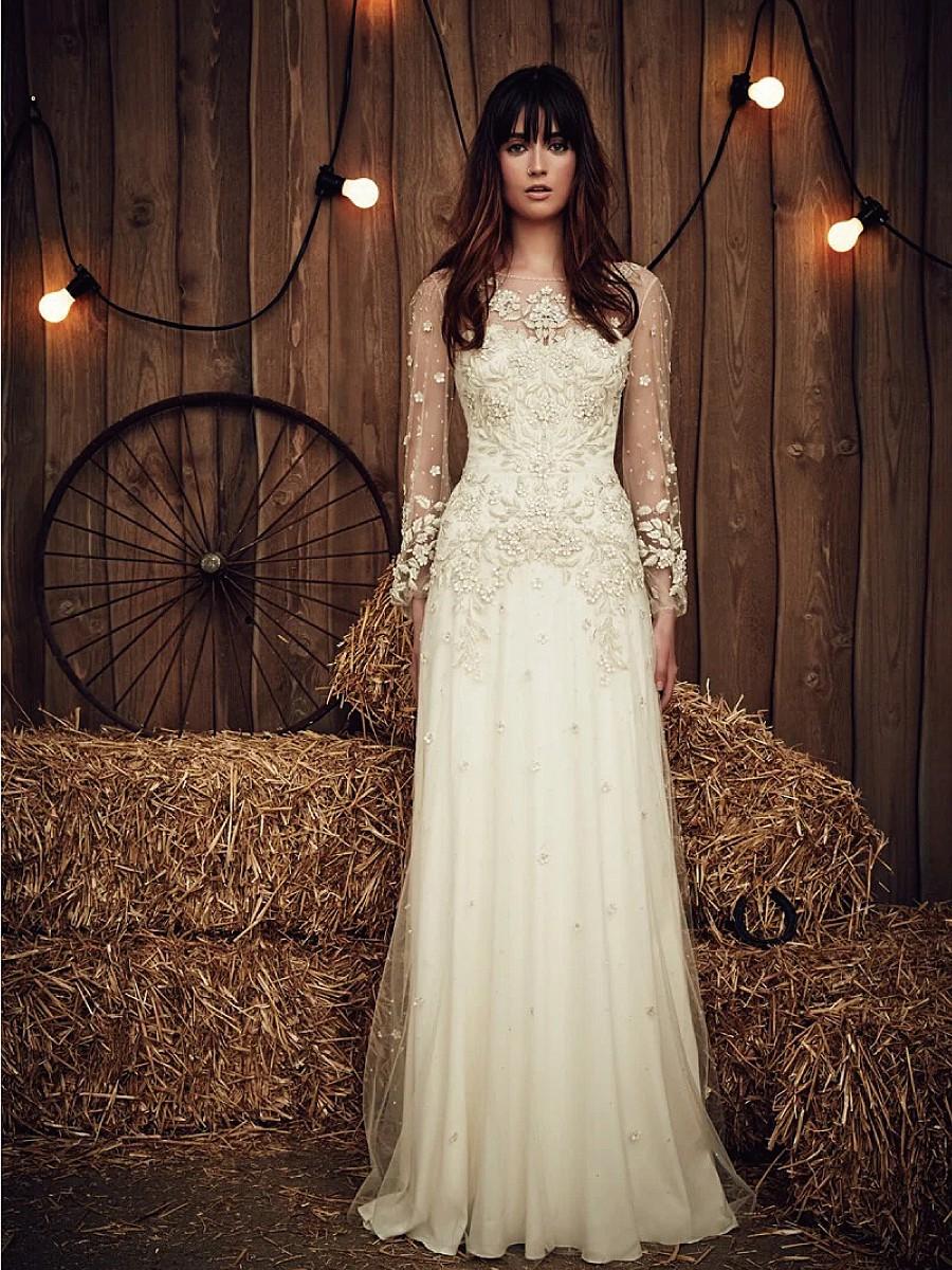 2. ボーホー柄レース×ロングスリーブのスレンダーラインドレス