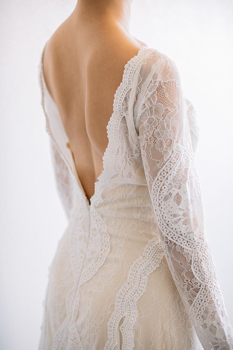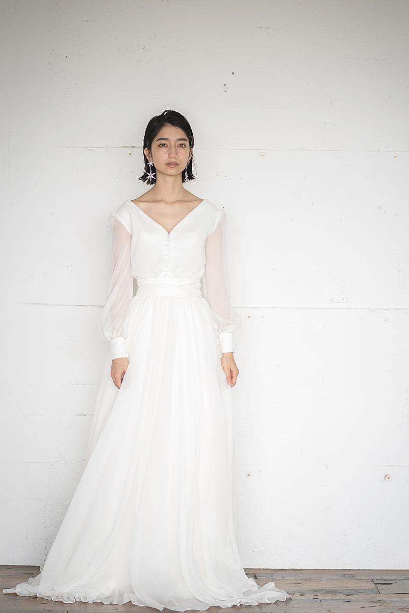 ゆるやかに膨らみを持たせたスリーブは、ナチュラルでリラクシーな空気感を漂わせつつ、動きに合わせて軽やかに揺れ、花嫁を柔らかく包み込みます。