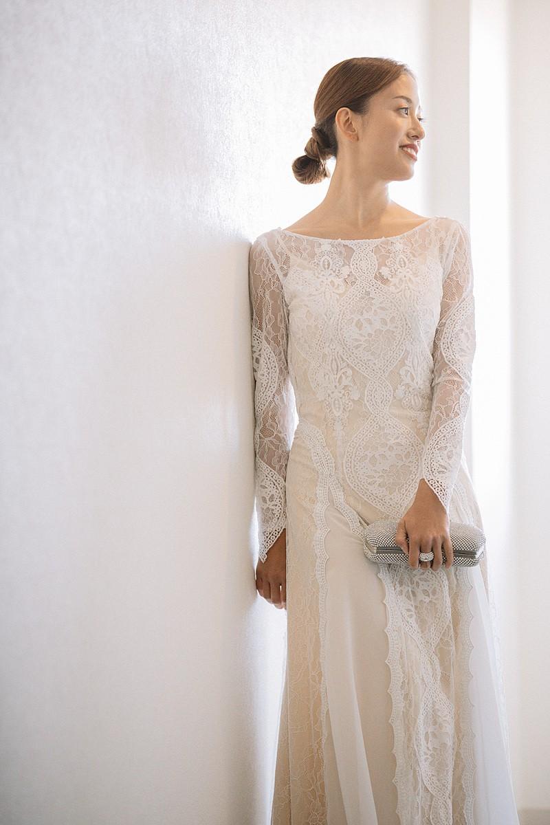 繊細な総レースドレスには、ナチュラルな質感を残した“ローポニー”や“ゆるやかシニヨン”が好相性。