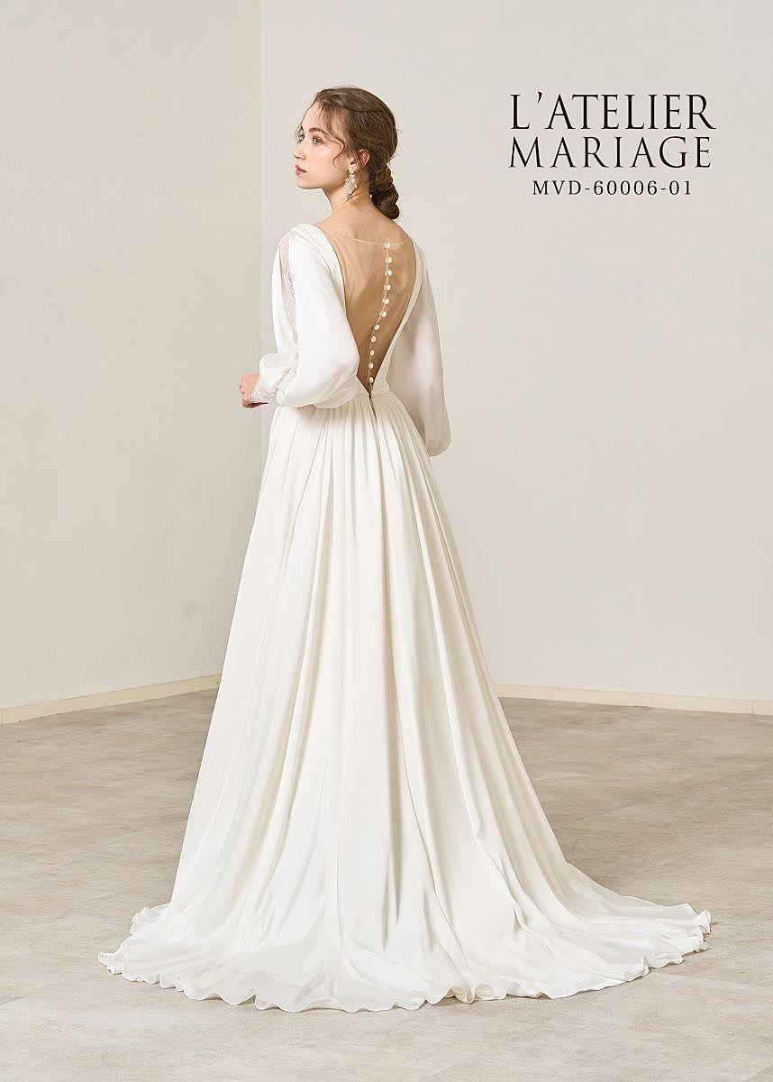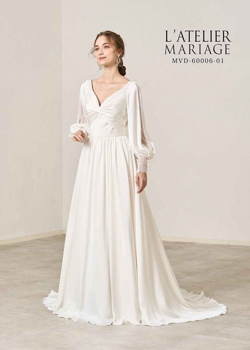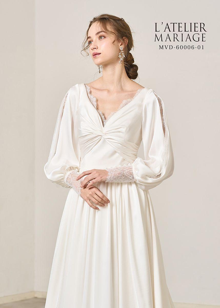 4. [L’ATELIER MARIAGE] ビショップスリーブ×ツイストデザインのスレンダーラインドレス
