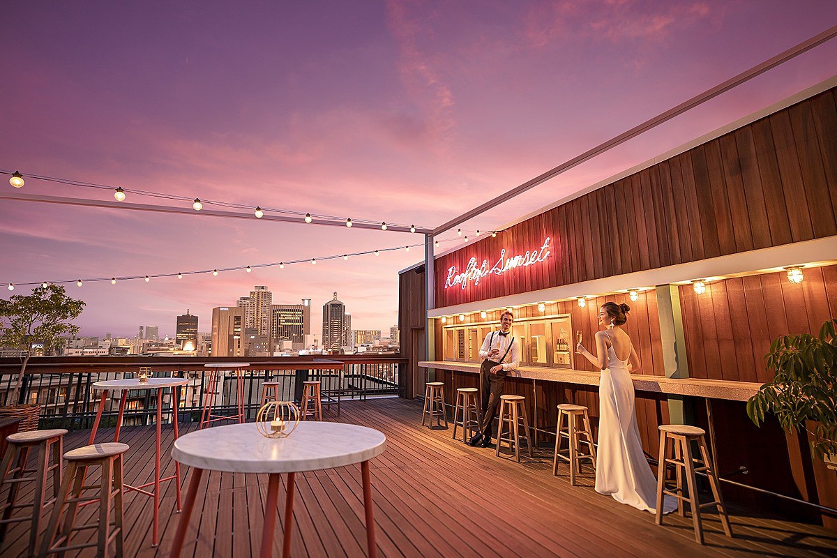 空を間近に感じられるルーフトップでは、挙式後のウェルカムパーティーを。