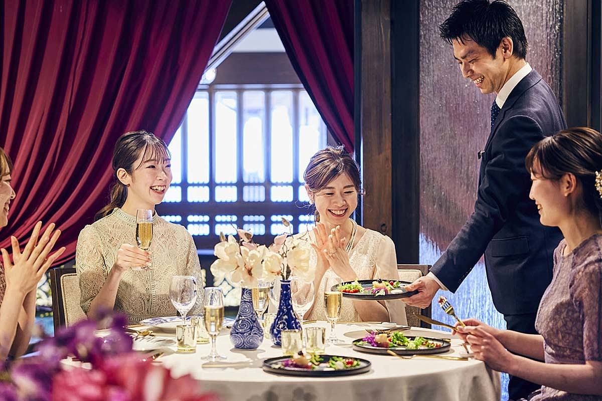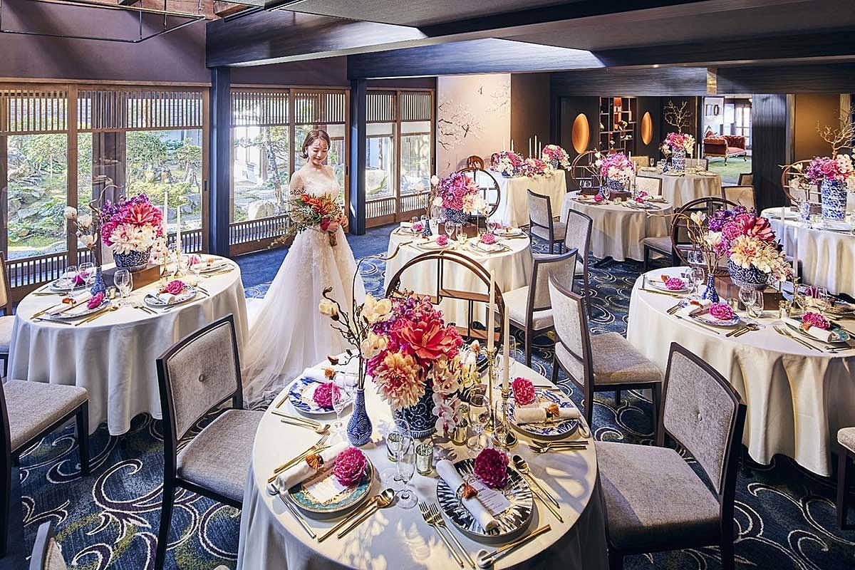 パーティー会場はぐるりと日本庭園に囲まれ、窓に目をやると和の風情と四季を感じられます。