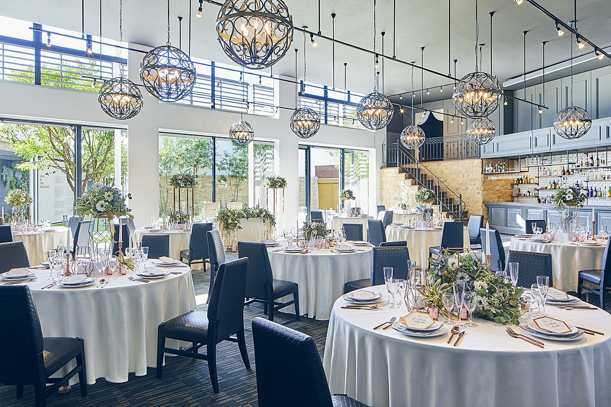 パーティー会場はグレイッシュカラーを基調としたモダンな空間で、大人花嫁に大人気。
