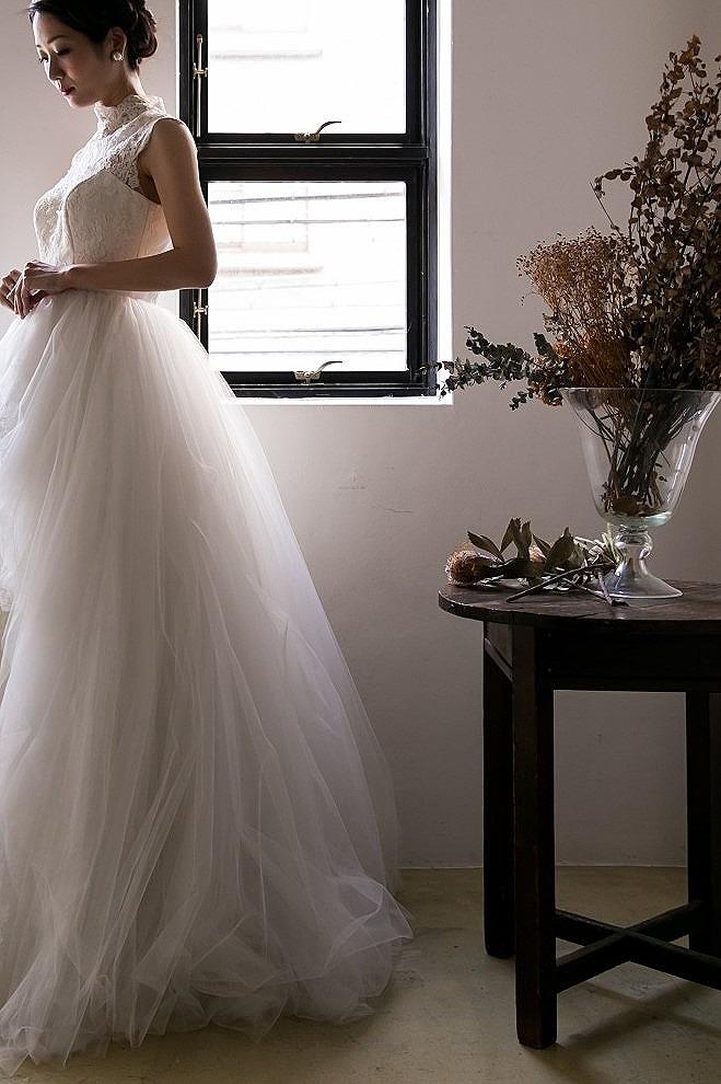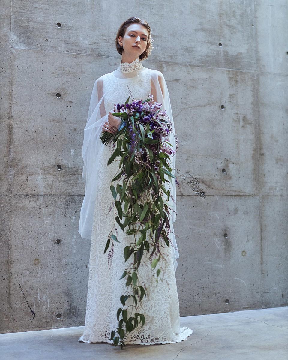 すっきりとしたスレンダーラインドレスには、ハイネックのチュールケープがふわりと覆い、とても幻想的な雰囲気を醸し出します。