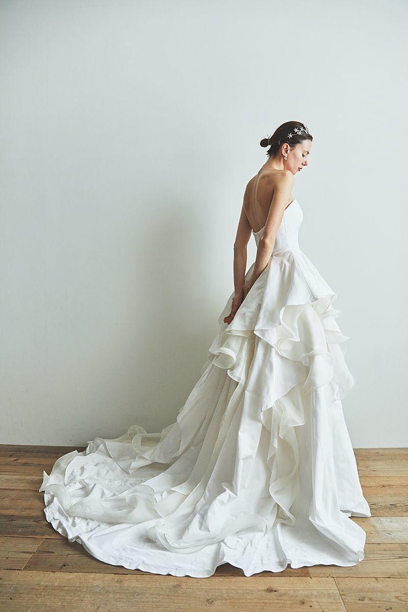ウエストからたっぷりとギャザーを寄せたタフタスカートが広がり、ボリューム感のあるロングトレーンへと続くドラマティックなシルエットに。