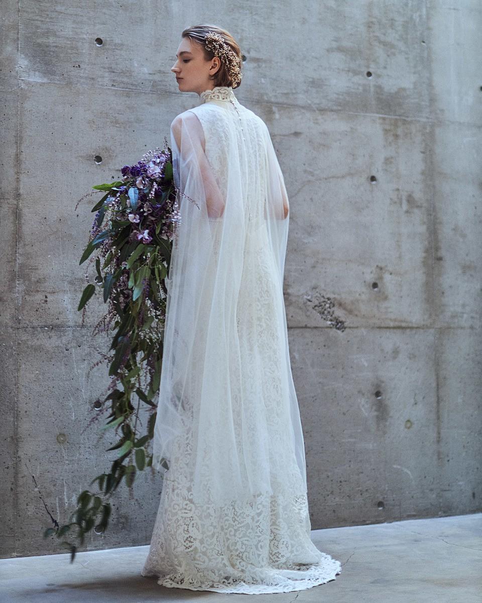 目を惹くケープにシンプルでありながらモードなレースドレスとフォトジェニックなデザインは、シーンや空間によって多彩な表情を見せてくれるデザイン性の高いドレスです。