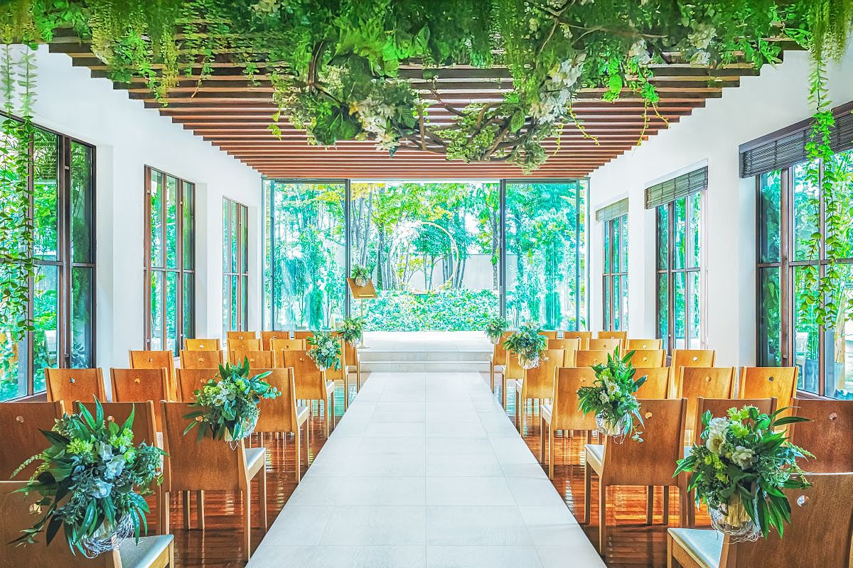 挙式は、天井から自然光が降り注ぎ、グリーンと花に包まれたナチュラルなチャーチ「獅子の聖堂(収容人数80名)」で。