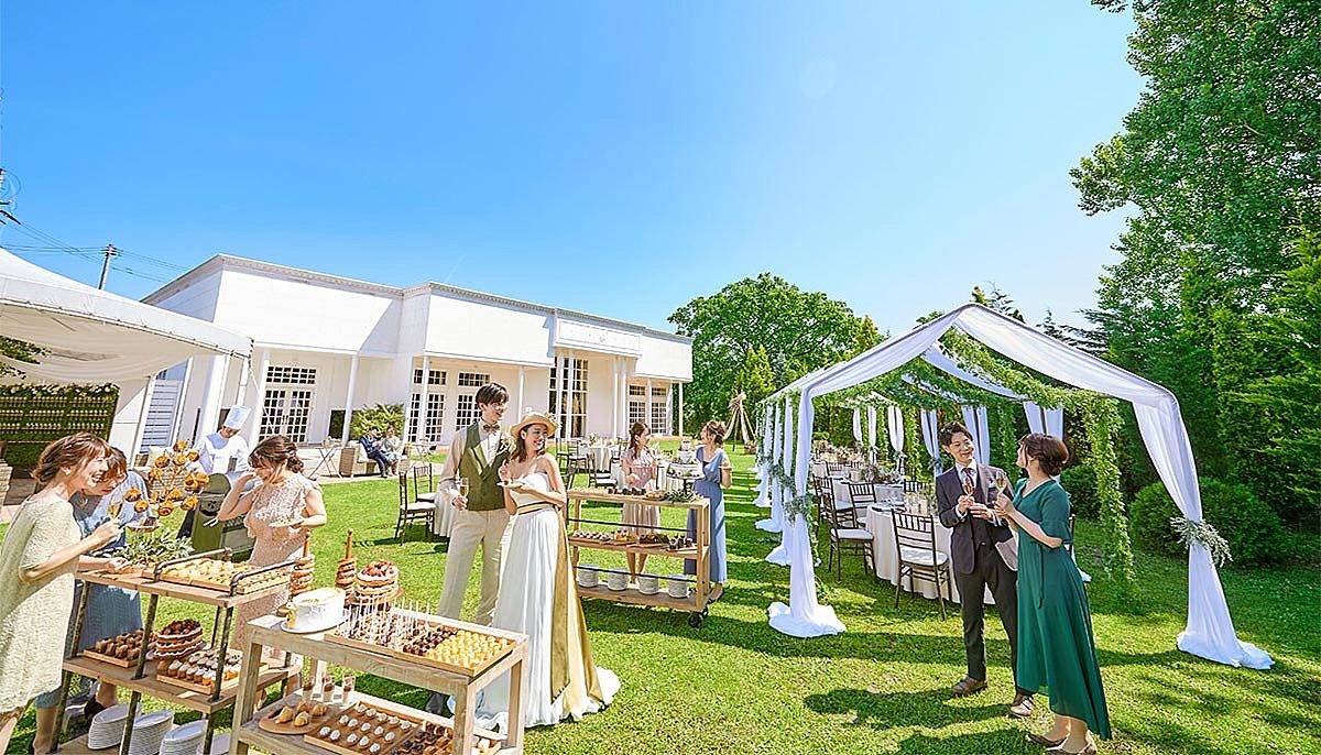 披露宴は、パーティー会場と自由に行き来できるプライベートガーデンが隣接しており、昼間は緑と空が彩りを添え、夜は幻想的なナイトウェディングが可能。