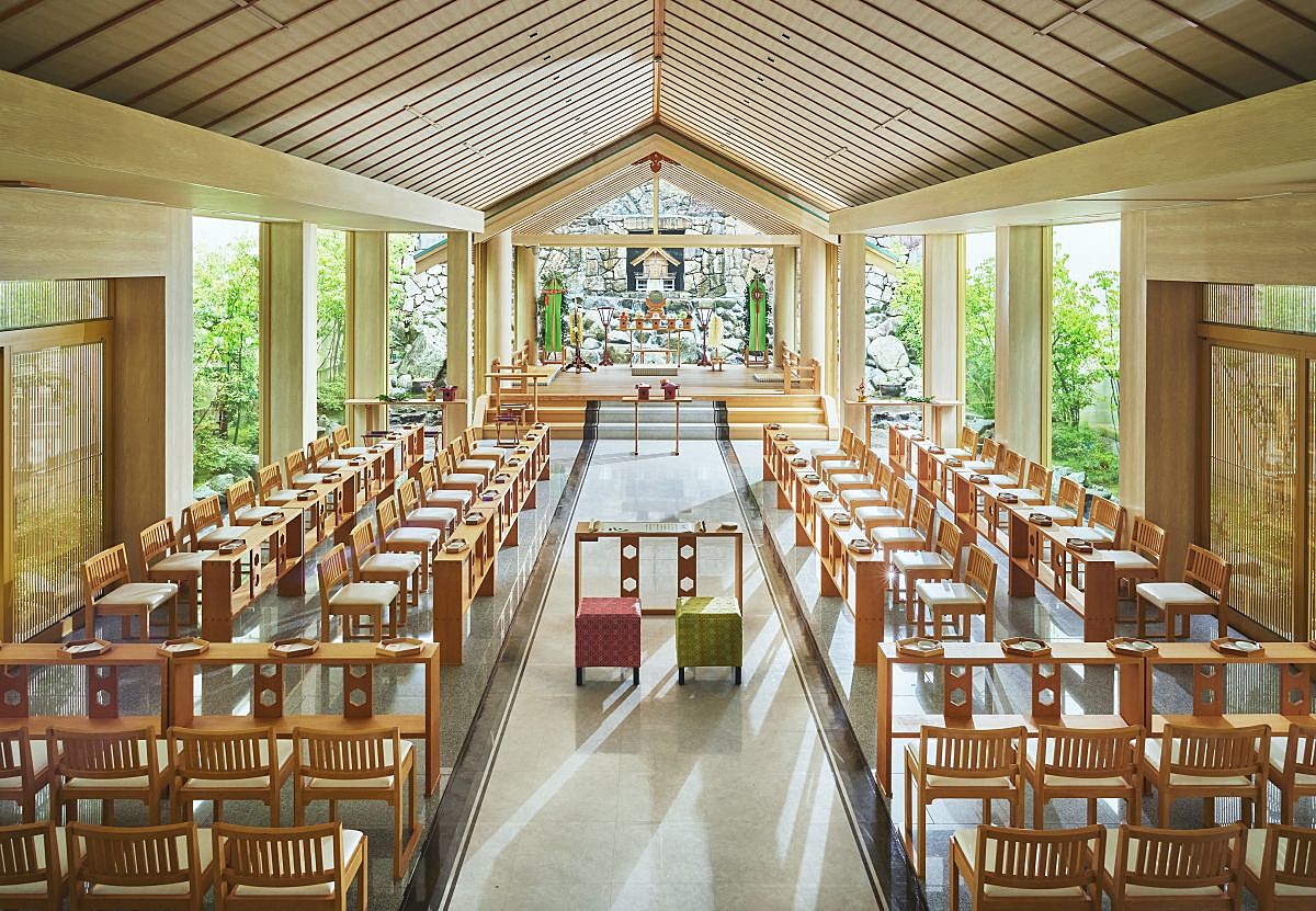 挙式会場「八重垣之杜(やえがきのもり)」は、縁結びの神様・大国主大神を祀る白木造りの神聖な空間。