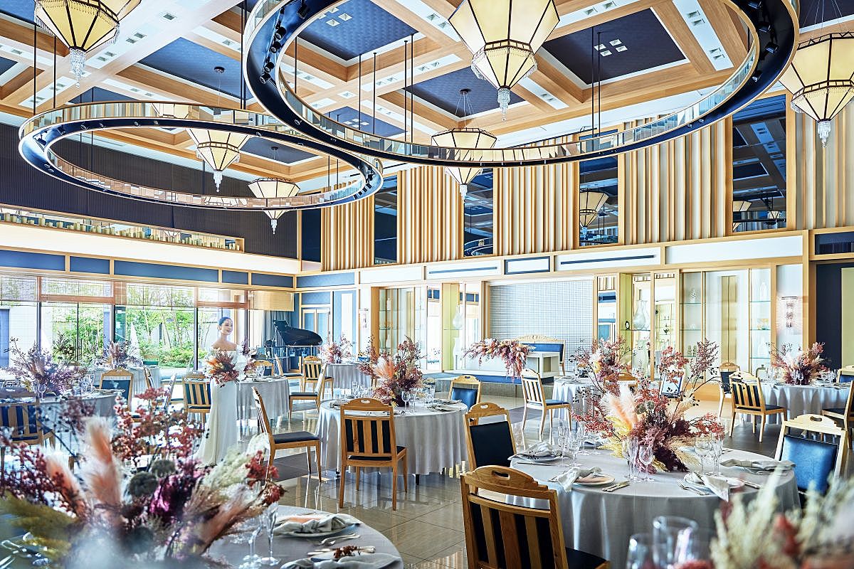 ガーデンでのデザートブッフェなど自由な演出も魅力。館内は広いロビーや待合スペースを備え、ゲストが快適に過ごせる工夫がされています。