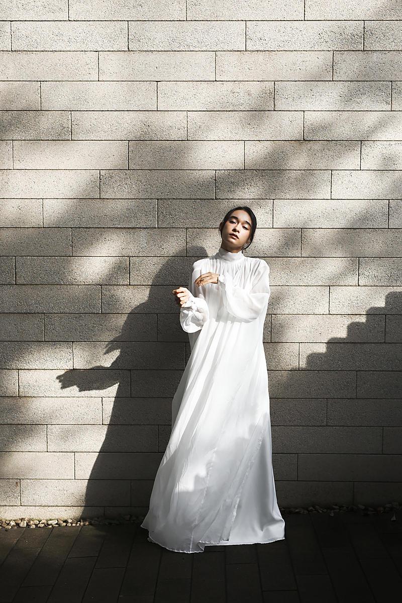 無駄を削ぎ落としたシンプルなデザインが魅力のドレスは、凛とした透明感を引き立てる「クリーンモード」なスタイルがぴったり。