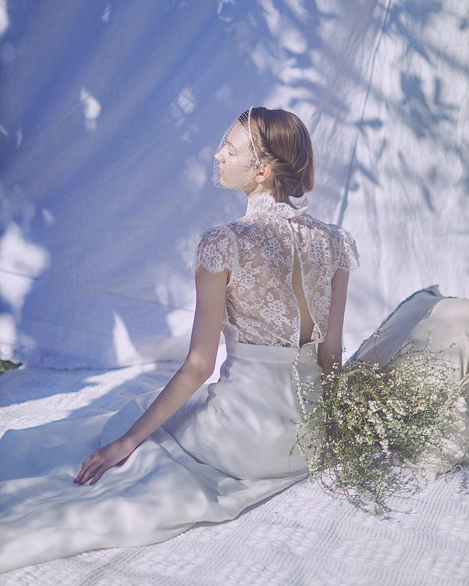張りのあるオーガンジーの下には、スペイン・バルセロナ製のレースモチーフを忍ばせ、シンプルな中に奥行きのある表情を生み出します。