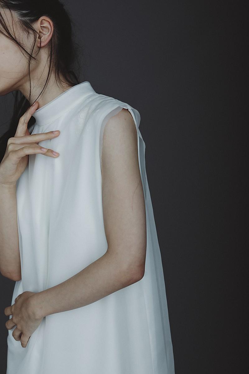 ミニマルな美しさを極めた、ストレートラインのハイネックドレス。