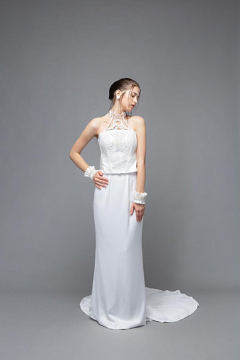 繊細なレースを贅沢に施したアメリカンスリーブのハイネックビスチェ × Iラインスカートのセパレートドレス。