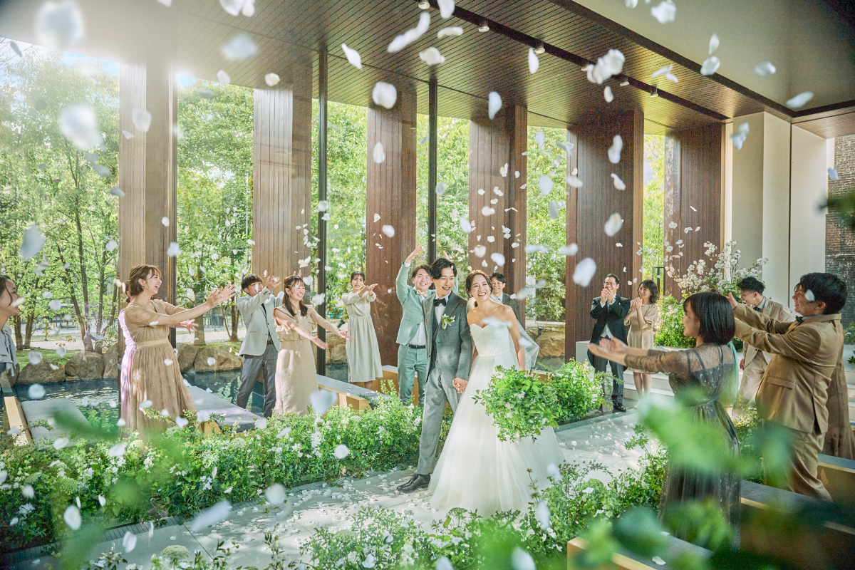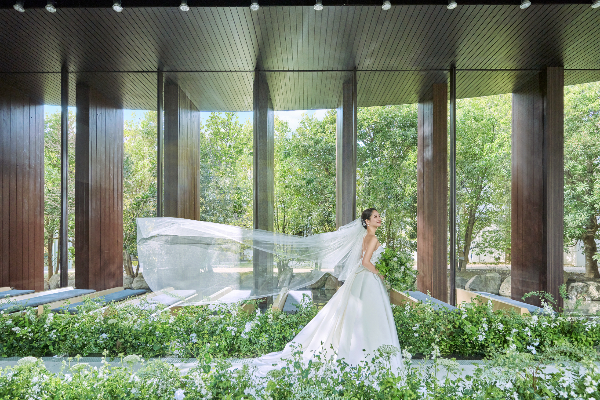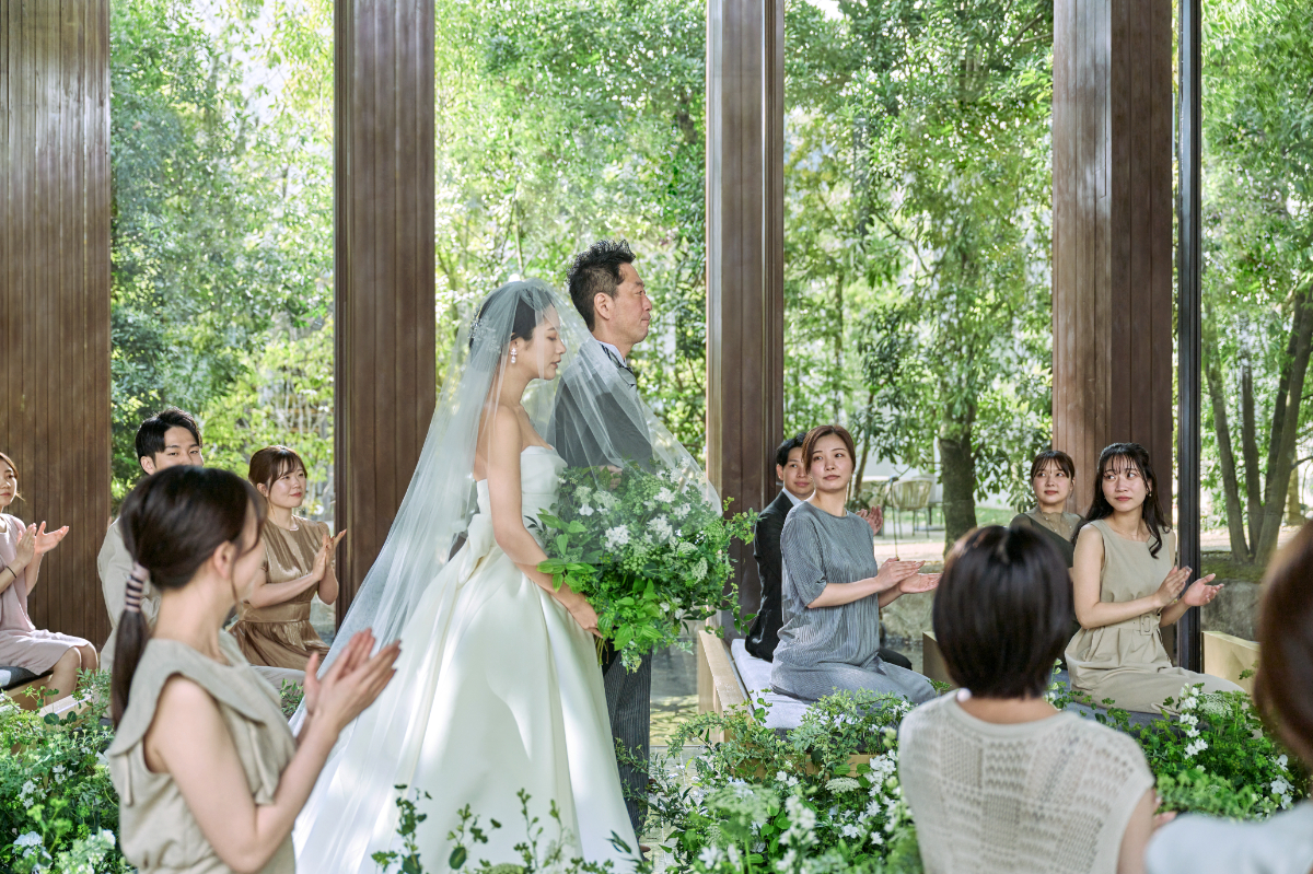 ガーデンの豊かな緑に包まれた純白の花嫁は、なんとも言えない美しさ。四季折々の自然と一体になったかのような、清々しい挙式シーンを叶えています。