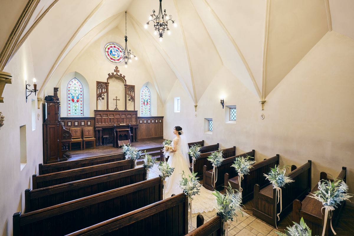 120年以上の歴史を持つイギリスの教会を移築したチャペルで、館内にはアンティークの調度品が配され、厳かな空気を創り出しています。