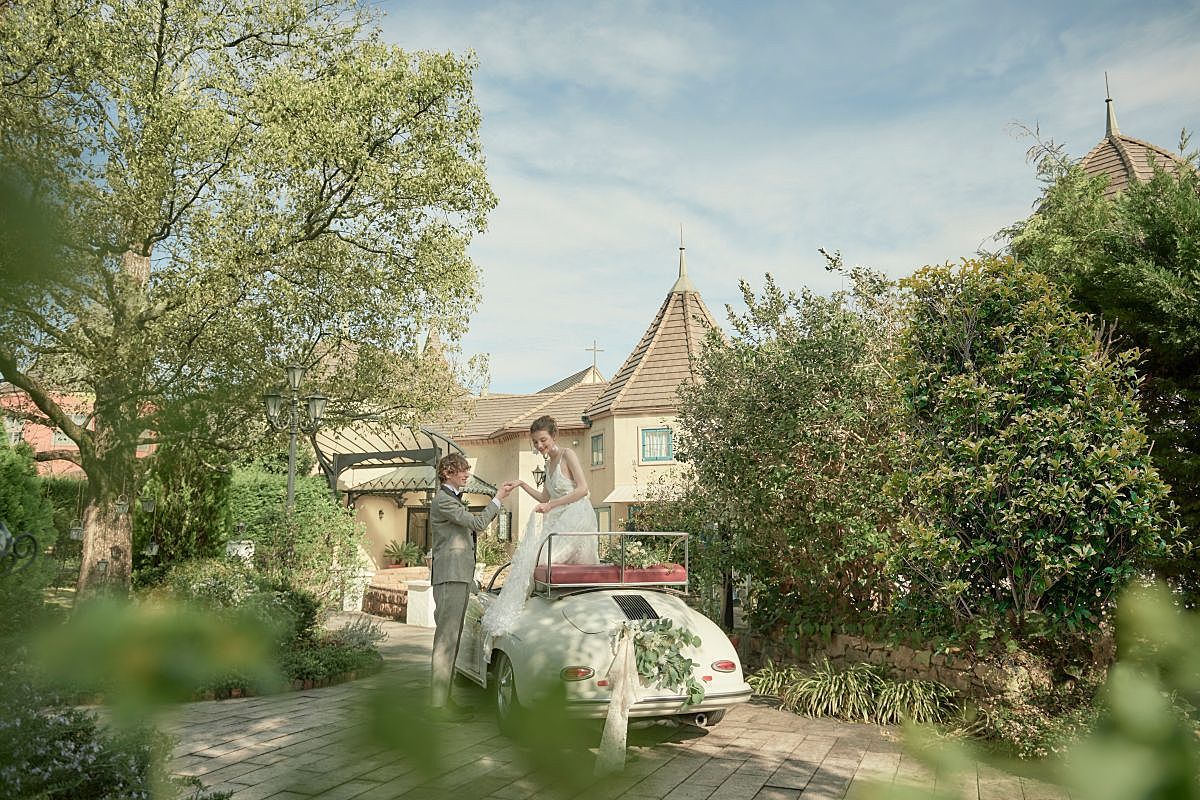 白と木の温もりがナチュラルな「フィラージュ」では、ガーデンからオープンカーで入場してゲストを湧かせるのも◎。