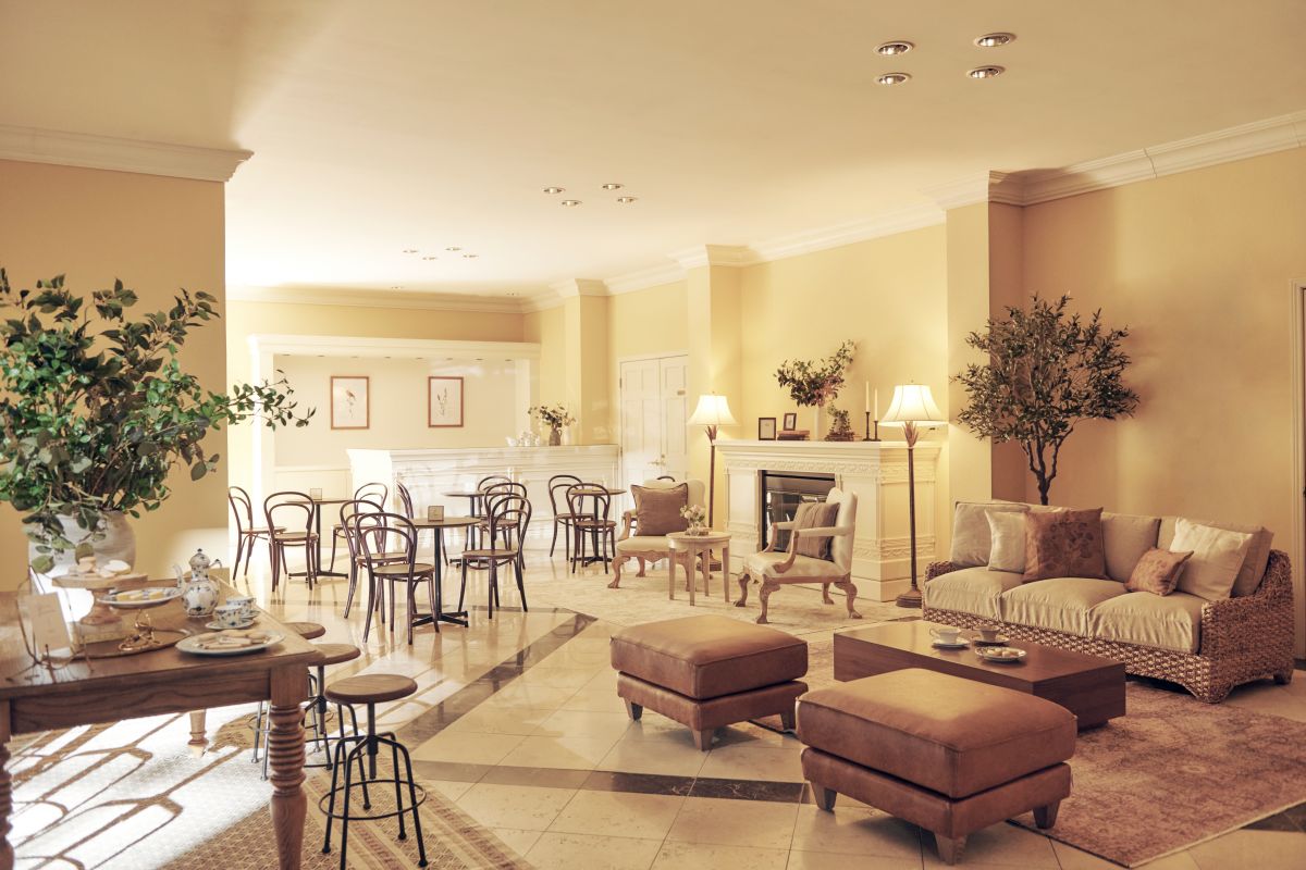 お天気がいい日は、アイアンの椅子とテーブルが並んだウェルカムテラスでゲストとティータイムも楽しめます。