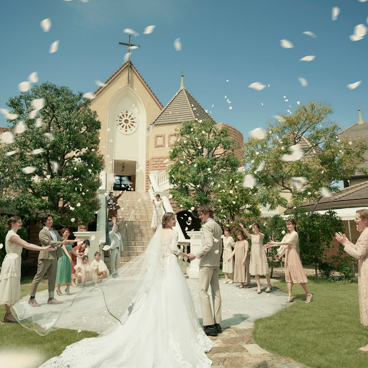 挙式後は、プロヴァンスの街を見晴らせる大階段でフラワーシャワーを。
