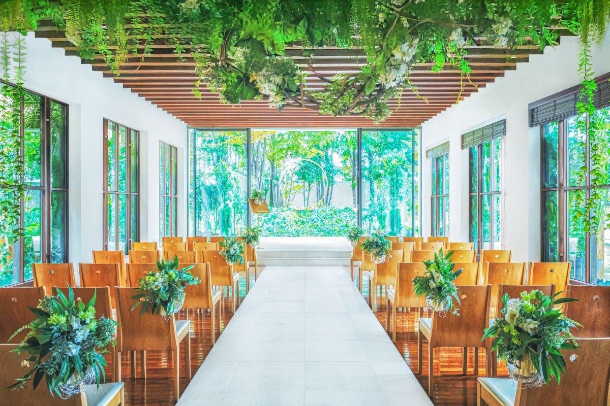 挙式を行う「チャペル(収容人数:80名)」は、祭壇奥が一面ガラス張りとなっており開放感抜群。