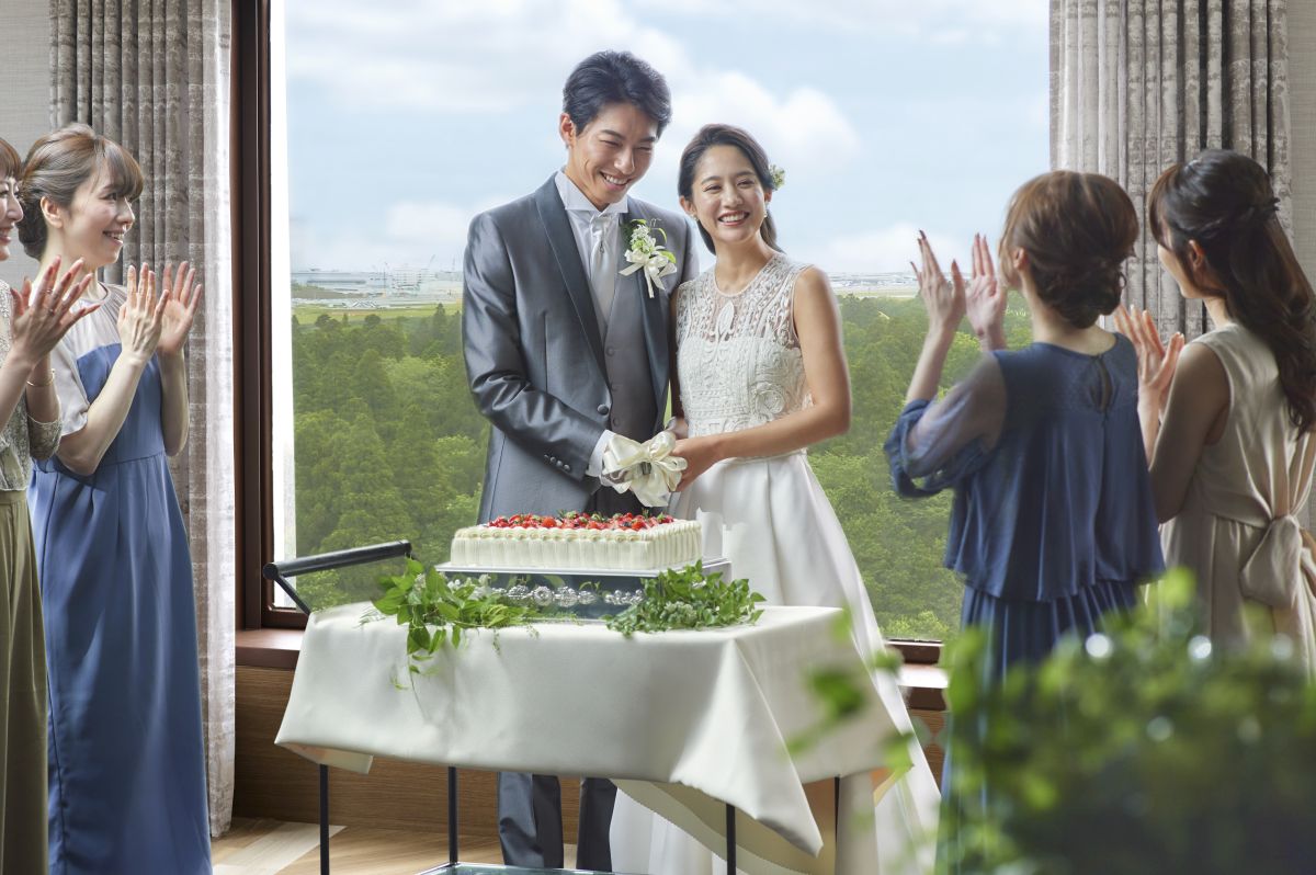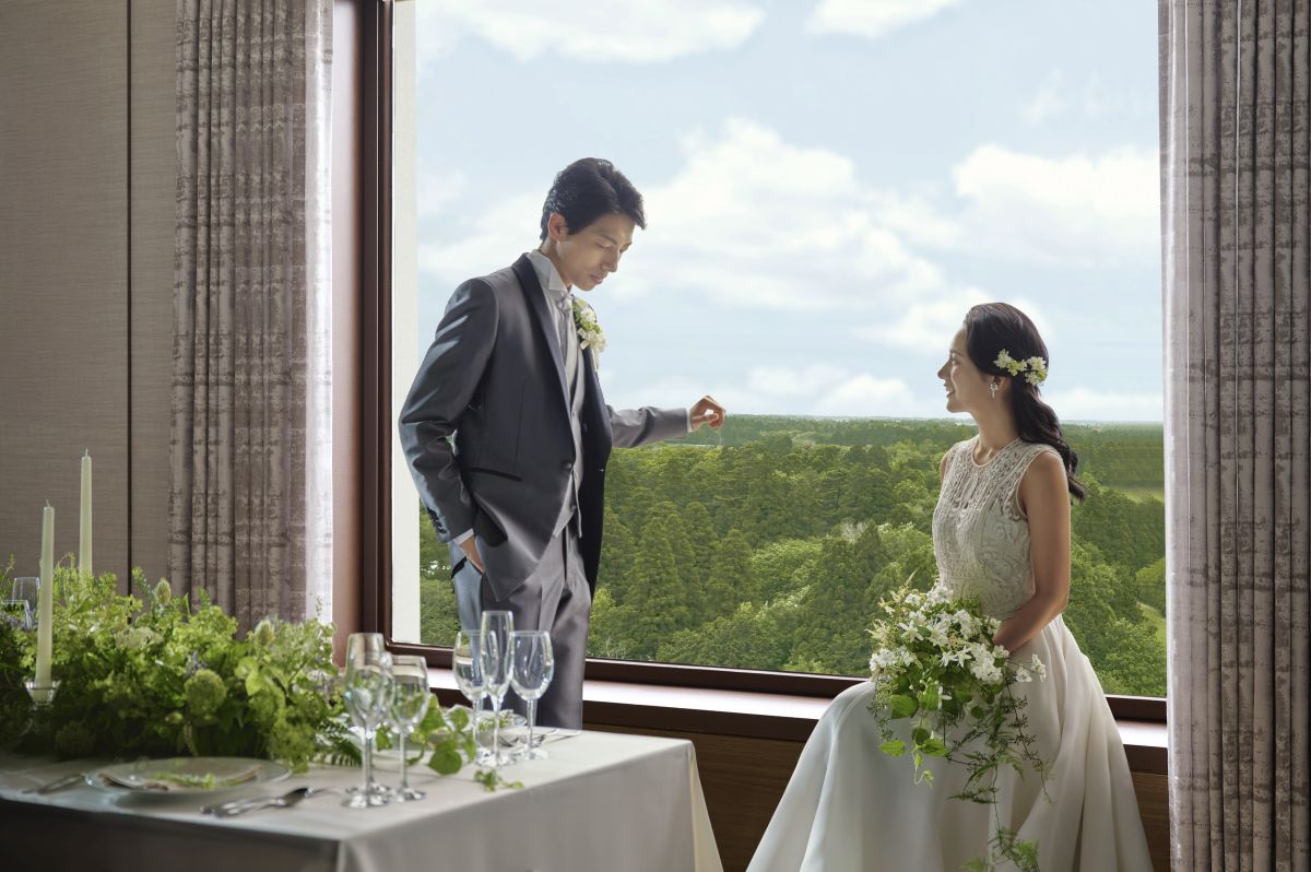 窓一面に広がるのは、抜けるような空と豊かな緑地の絶景。成田空港から発着する飛行機が見える点も、多くの新郎新婦の心を掴んでいます。