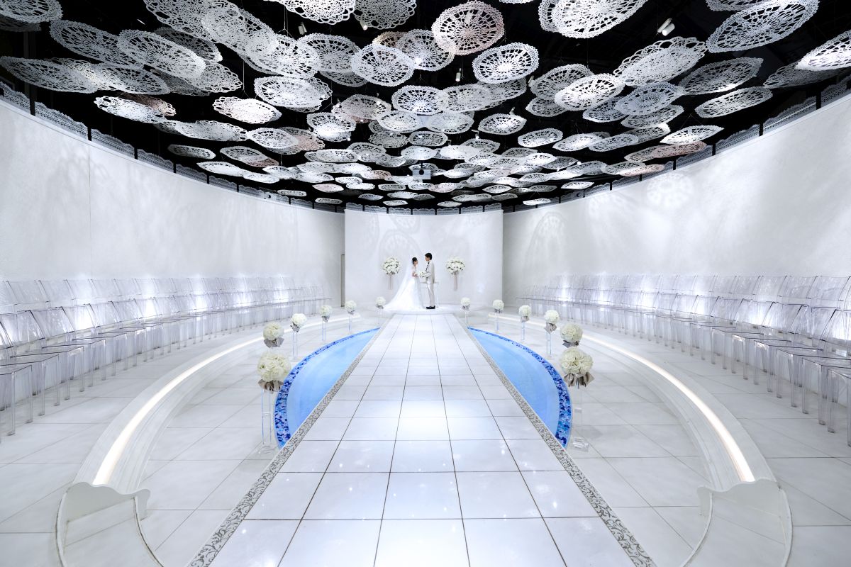 チャペルとしては珍しい劇場のような円形の作りになっていて、ゲストは中央を向いて座るため「バージンロードを歩む二人の姿が見やすい」と好評です。