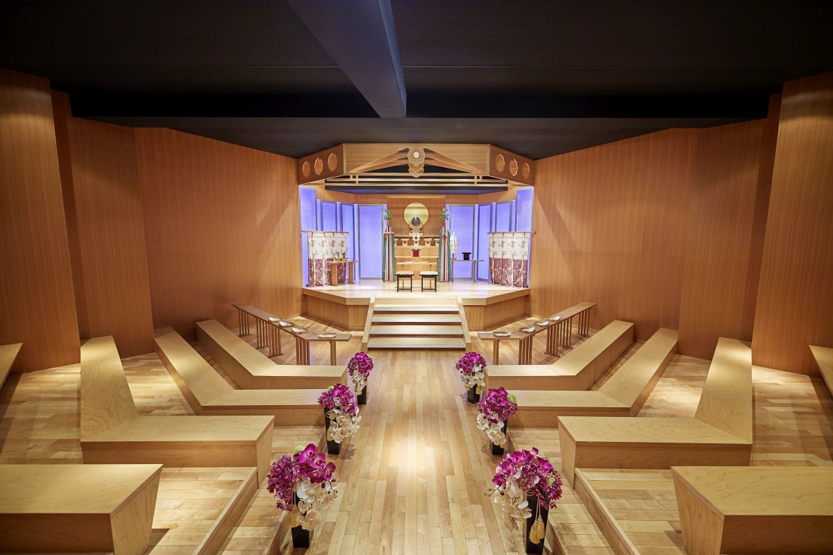 和婚希望の二人にオススメの神殿「清明殿」は、伝統美の中にモダンなエッセンスを散りばめた会場。能舞台の意匠を取り入れていて、どの席からも二人の姿がよく見えるつくりです。神前式はもちろん、和の人前式もオススメですよ。