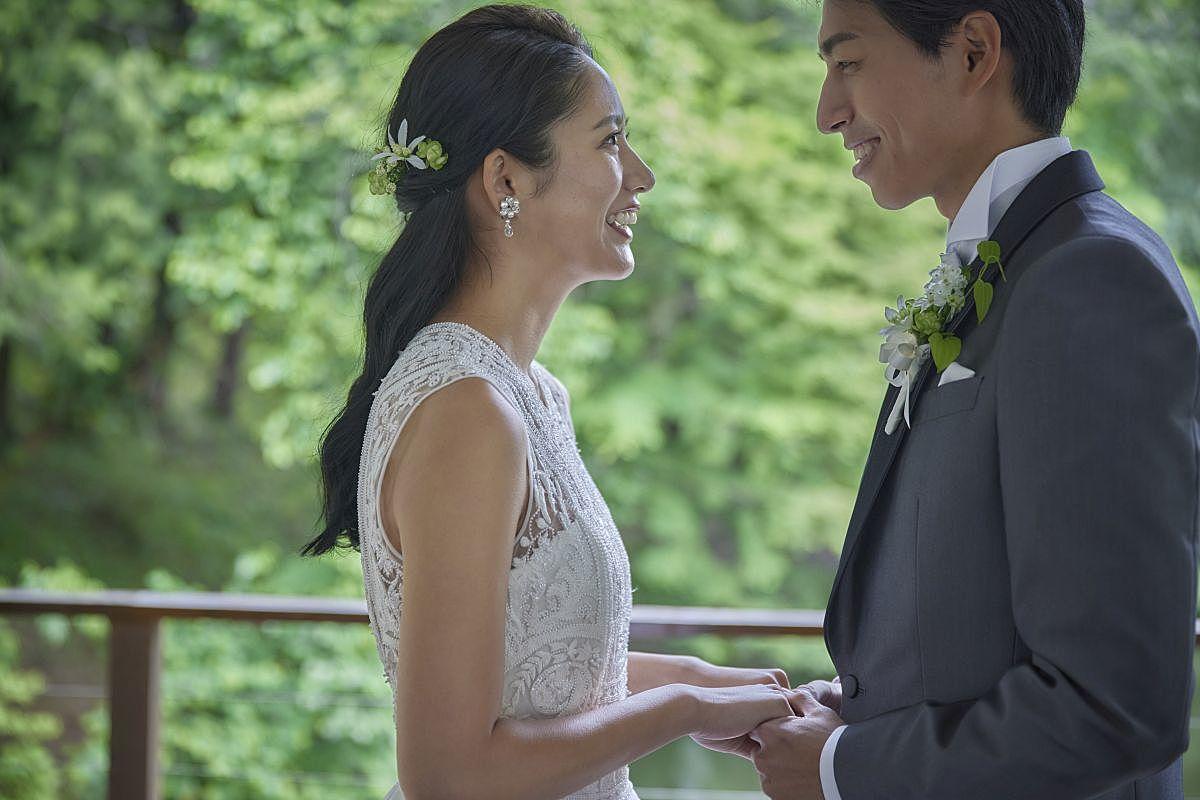 セレモニー中に聞こえてくるのは風がそよぐ音や木々のざわめき、鳥の立てる水音。青空の下、水辺で行うフラワーシャワーは開放感バツグンです。