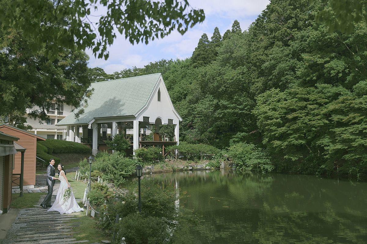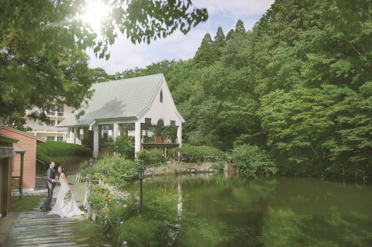 広々としたホテルの敷地内には木々が繁り、鯉が泳ぐ大きな池も。「フォトジェニックな写真が撮れる」と評判を呼んでいて、ロケーションフォト撮影やフォト婚でも人気が高い会場です。