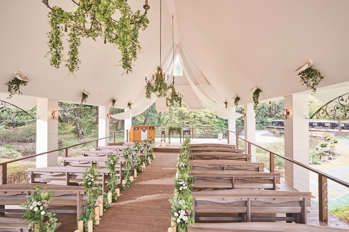 緑と風を感じたい二人には、自然と一体化するように佇むガーデンチャペル「ル・シエール」がオススメ。