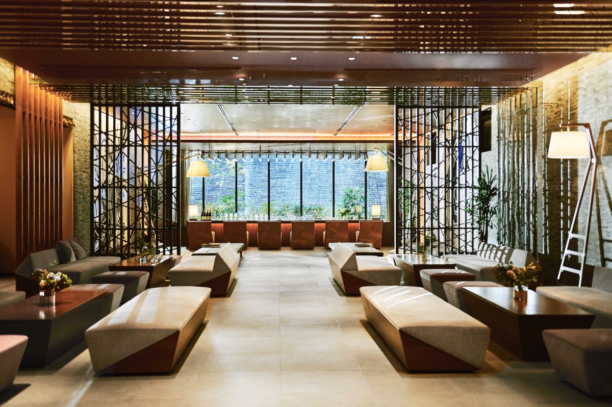 和の趣きをさりげなく取り入れたシックなインテリア、スタイリッシュなバーカウンター、窓越しに流れる滝…と、ラウンジ内は上質感たっぷり。