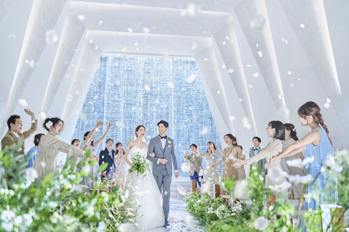 純白チャペルのいいところは、天候に左右されにくいところ。光を反射するため、どんなお天気でも明るいセレモニーが叶うんです。
