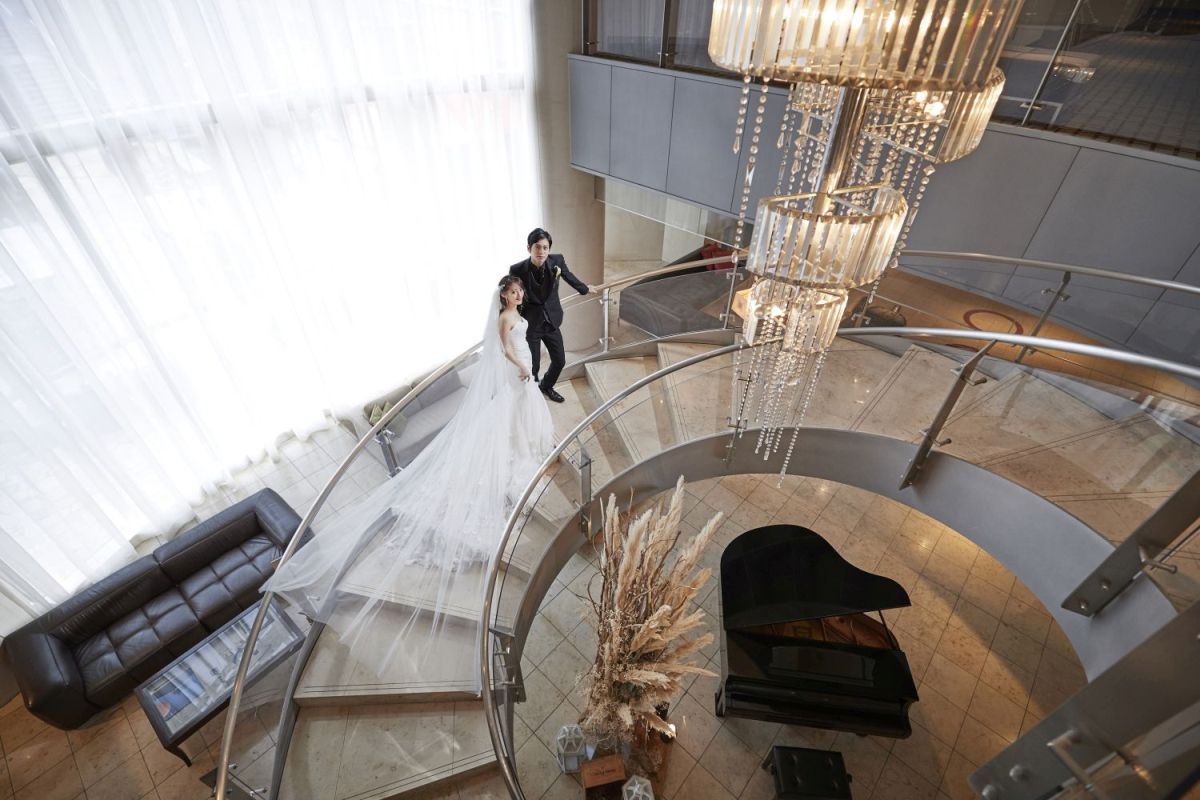 挙式後は、屋外のガラス階段でのアフターセレモニーもおこなえます。太陽の光と爽やかな風の下で、開放感あふれるフラワーシャワーの演出も叶いますよ。