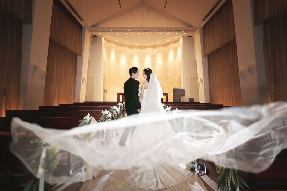館内は木目調の落ち着いた雰囲気で、純白のバージンロードやイギリス直輸入のステンドグラスが美しい空間です。
