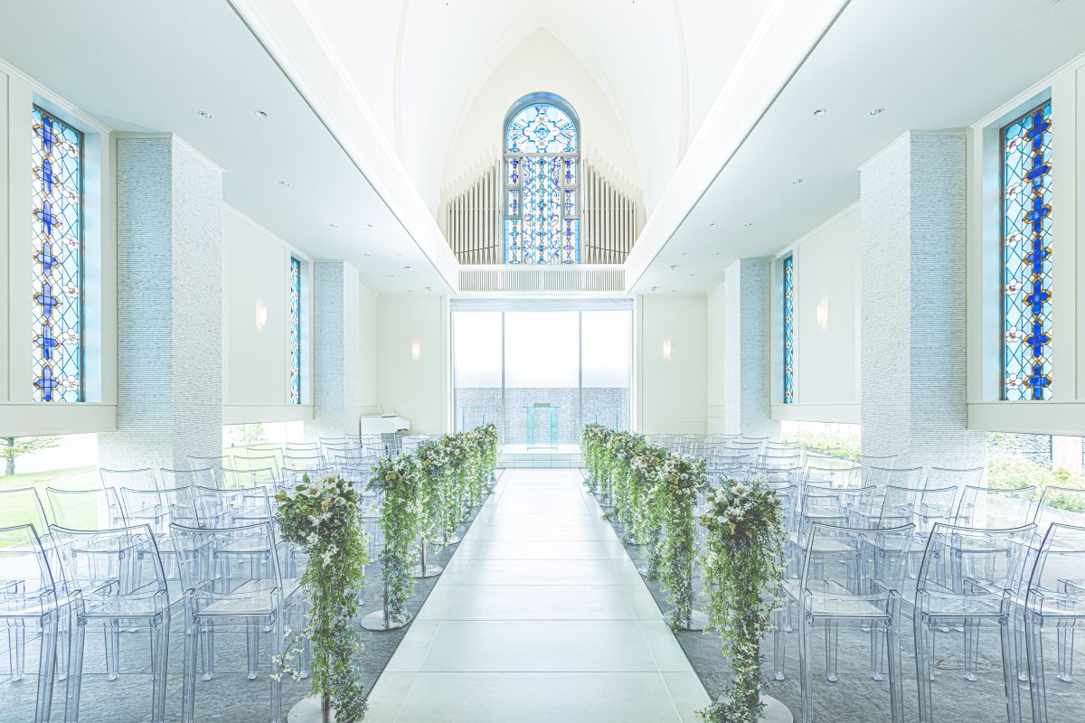 四方から光が降り注ぐ幻想的な空間で、挙式後にはガーデンにてアフターセレモニーを行えます。