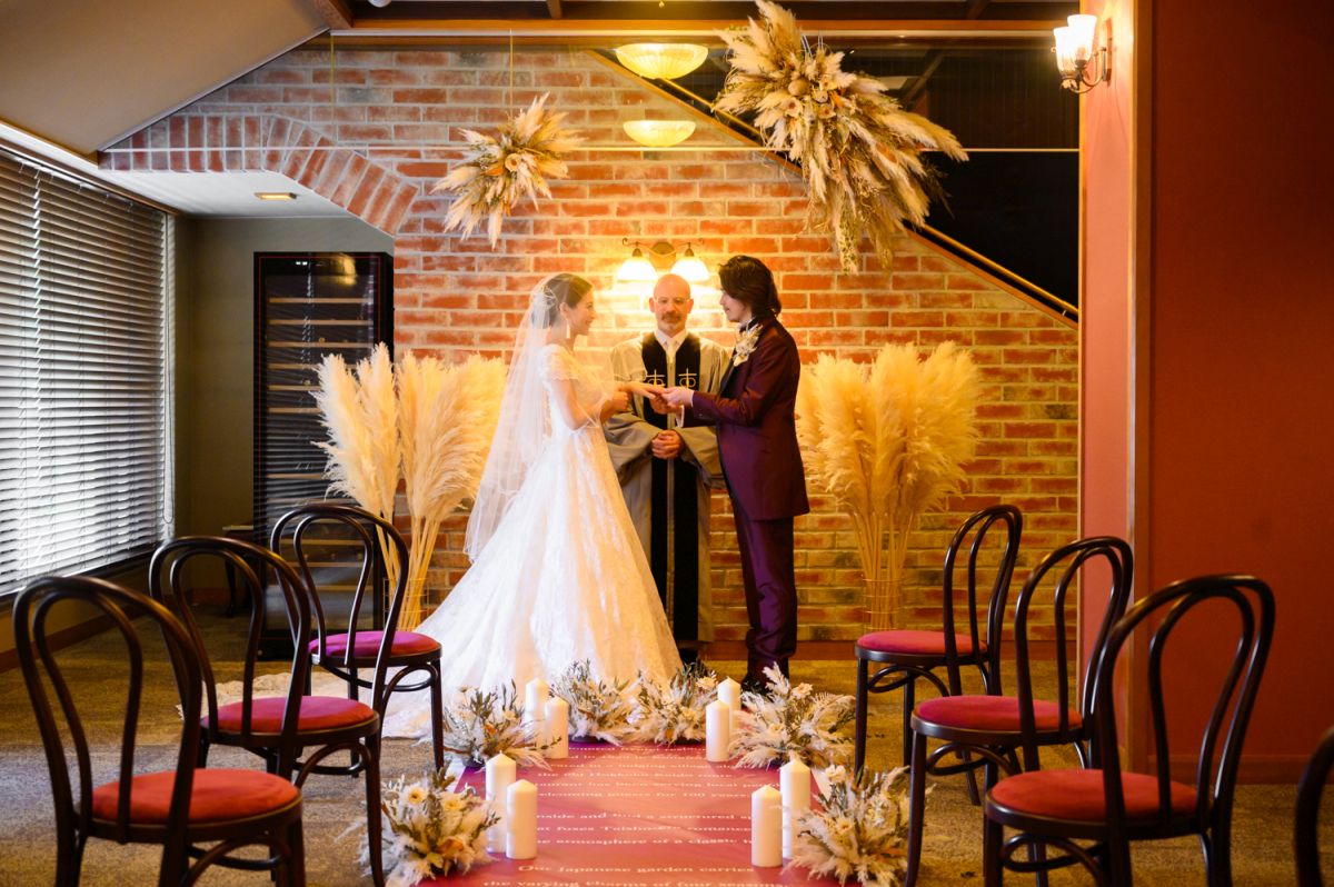 モダンなデザインのシャンデリアとレンガ壁が特徴的な、クラシカルなロビーでの挙式も可能です