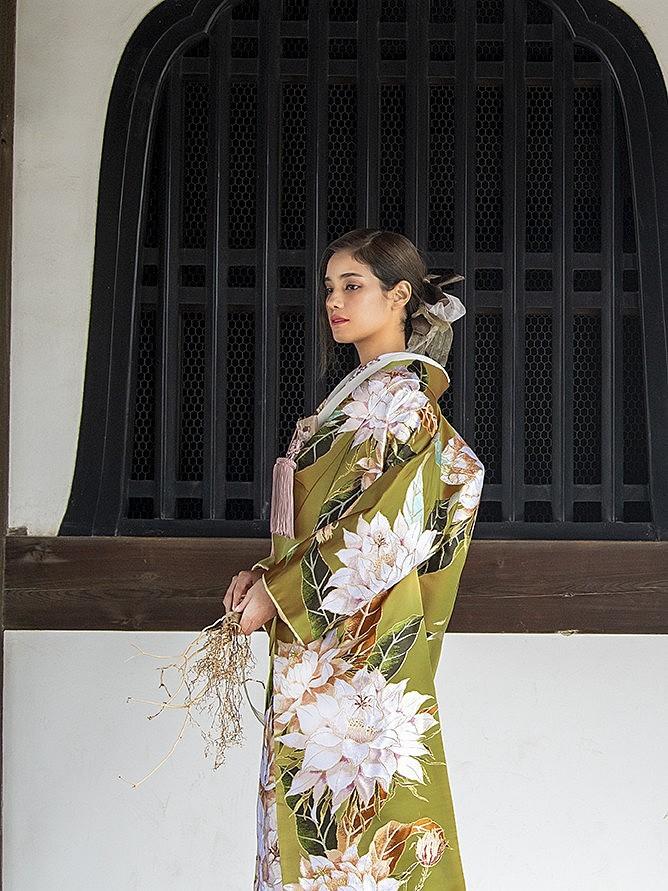 2. 伝統色・オリーブグリーンに白い月下美人を描いた色打掛