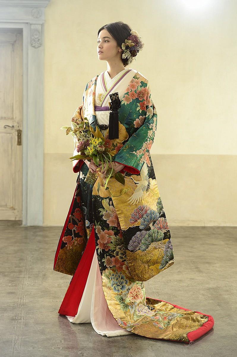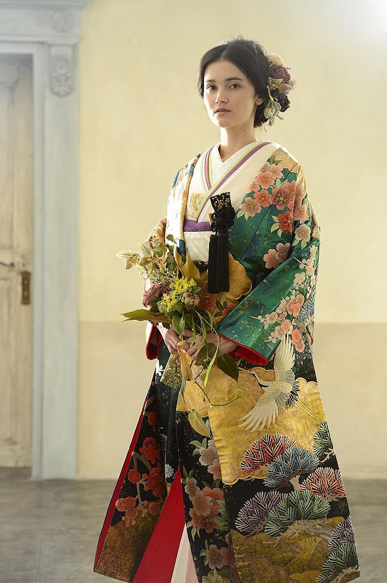 4. 深緑×ブラック×ゴールドの重厚な世界観が際立つ“飛鶴松”の引箔打掛
