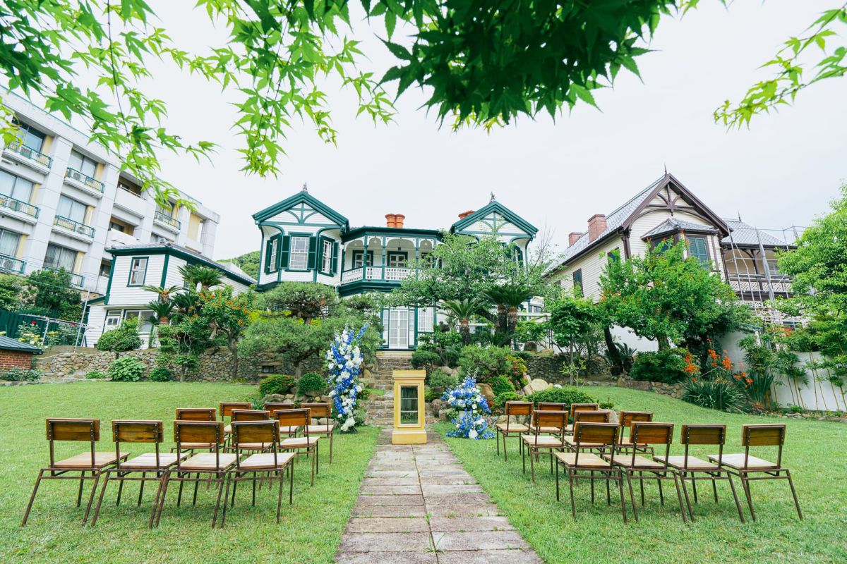 異人館をバックに緑と季節の花々に包まれて行うガーデンパーティーは、まるで海外のホームウエディングのように非日常感たっぷりでオススメですよ。
