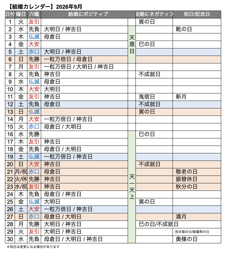そこで今回は2026年9月の「結婚全般に縁起のいい日」と「内容によって縁起のいい日」、「要注意日」について解説。結婚イベントの日取りに役立ててくださいね。